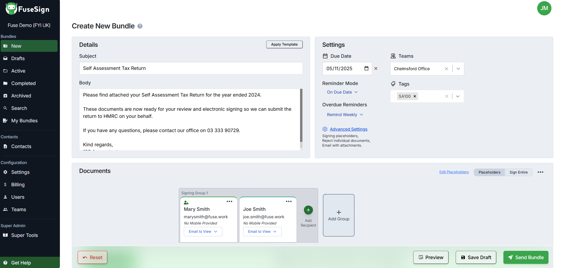 Bundle multiple docs Send SA100s, engagement letters, and supporting documents together. |